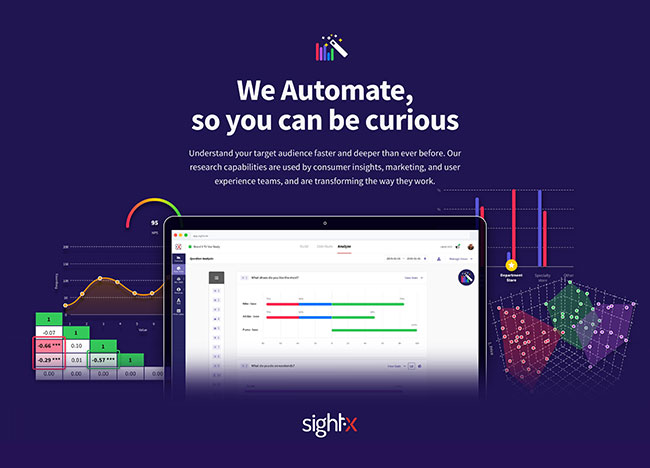SightX is an automated end-to-end consumer insights platform that enables you to drive more efficient data-driven decision-making. The intuitive interface and automated analysis capabilities make it simple to dynamically test product or ad concepts, get results within hours and have all of your analysis and reporting in one solution. By providing users with the most robust yet flexible platform in the world, SightX enables you to impact your brand with just the click of a button. Find out how consumer insights, marketing and CX teams at leading organizations use SightX to transform the way they work.
