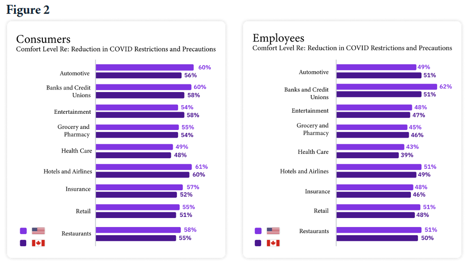 We found that one in two consumers and employees were comfortable with the possible reduction of COVID restrictions and precautions in the coming year.