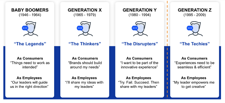 Before we dive into the trends, we want to give a quick summary of what we know about each generation and how they behave as both customers and employees (Figure 1). We noticed that these generational attributes came into play across each trend.