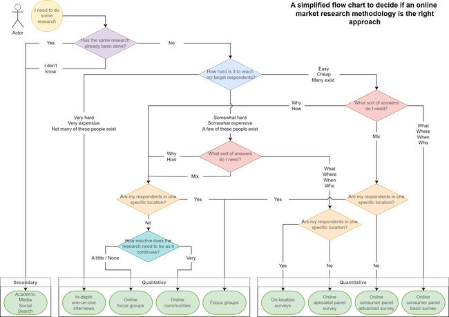 Here at our firm, our team was recently asked to recommend a research approach by a client without previous research experience. Our conversations revolved around five key questions and eventually turned into the accompanying flowchart. Use these five questions to simplify the research methodology decision-making: