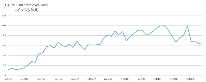 For example, the word インスタ映え(Insta-bae), meaning Insta-worthy/Insta-grammable, was voted one of the words of the year for 2017. This year, many companies in Japan have focused their marketing efforts on the keyword Insta-bae hoping to catch the attention of this growing trend. The word is expected to grow in the coming months (Figure 1).