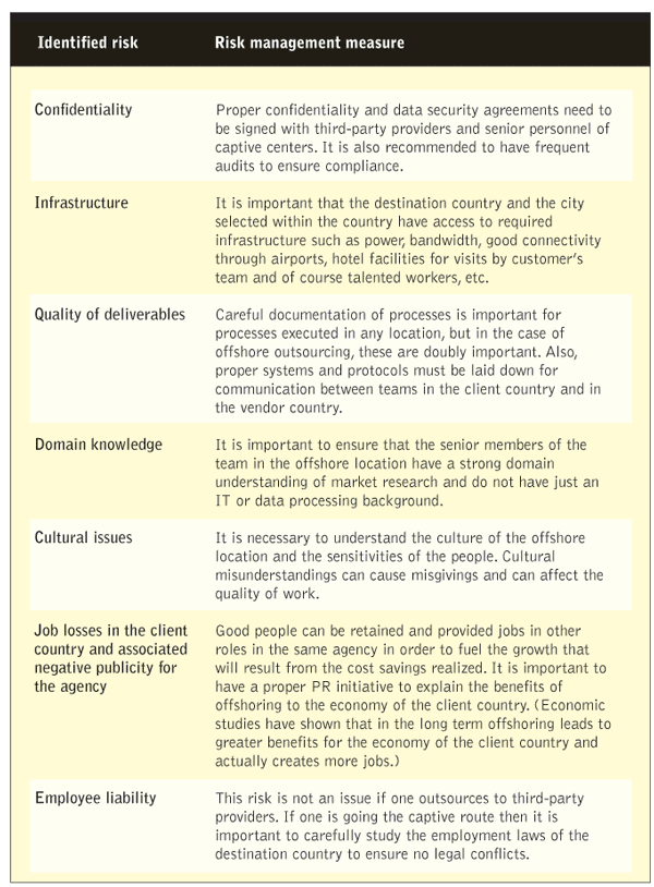 While the benefits that can be had from offshore outsourcing are substantial there are also certain key operational and business risks. From our experience managing outsourcing engagements for clients, we have been able to identify certain risks and measures to mitigate them. Part of this list is outlined in the accompanying table.