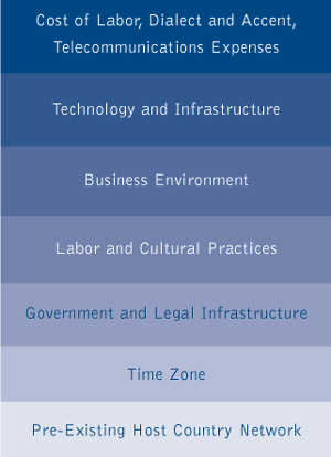 methodological approach to narrowing options. If used as a sieve, the various categories and factors can be quite effective in taking many choices and narrowing them down to a few, highly refined options which can be explored with in-country visits. In-country visits should only be made when options for a final decision have been selected, making the in-country visit investment the penultimate action to a go/no-go decision. The six categories are used as sequential layers of the sieve ordered by their significance to the business operation(s) being considered for the location. In addition, a top layer is added to the sieve comprised of only those two or three factors deemed most important to driving the business decision to offshore. For example, a survey research call center selection model might rate labor cost and accent along with telecommunications expenses most highly, with other factors following. So in this case a sieve design as shown here might be most appropriate.