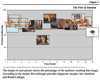 Analysis of the pattern of recall, shown in the example in Figure 2, is an important predictor of commercial attention and brand linkage. Basically, this technique measures how viewers process the images in the commercial on a cognitive level. It tells us which images the viewers find meaningful, if they are able to follow the storyline, and if they are giving the brand the focus required for good brand linkage.
