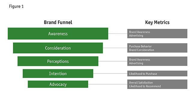 What are the key metrics for an effective tracking study? You can’t design any questionnaire unless you base its design on the objectives of the research. For an advertising tracking study, you need to go back to the strategy that was created for the development of new advertising (the copy strategy) as well as the marketing and media plans. What is the copy trying to accomplish? Is it directed at new users or prospects or is it designed to reassure your loyal user base? Think hard about what you are trying to accomplish and design the survey accordingly. Figure 1 shows a way to conceptualize the types of questions you would want to include in the survey as you view the marketing funnel overall.