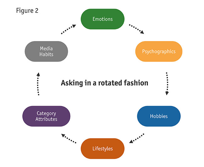 All other question areas, except for the demographic profiling section, can be covered in a rotated fashion so that not everyone is asked every question. This will help to limit the length of each questionnaire. The answers to these question areas are typically lower priority and a smaller sample for analysis is often adequate. As an example (Figure 2), one-third of the sample could be asked two of these modules each, so that all modules are asked among the same number of respondents: emotional assessment; category attitudes; lifestyles; psychographics; hobbies; media habits. So, one-third emotions and psychographics, one-third hobbies and lifestyles and one-third category attitudes and media habits, etc.