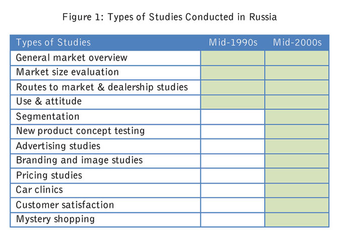 The projects conducted early in the life of the Russian market research industry were largely based around market access, market sizing and routes to market. This reflected the fact that buyers were foreign companies with little knowledge of the Russian market and little or no presence in the market.