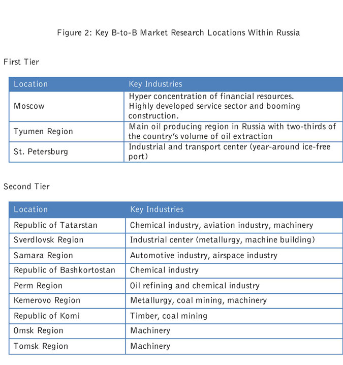 Scoping. Russia is a vast country and it is impossible to research it all at once. Is it really the whole of Russia you are interested in? If you entered the Russian market, would you really be able to service Vladivostok on the Pacific coast as well as Moscow? Are your customers really spread equally throughout the country or are they concentrated in one or two regions? Far better to focus on the region or regions that are important to you.