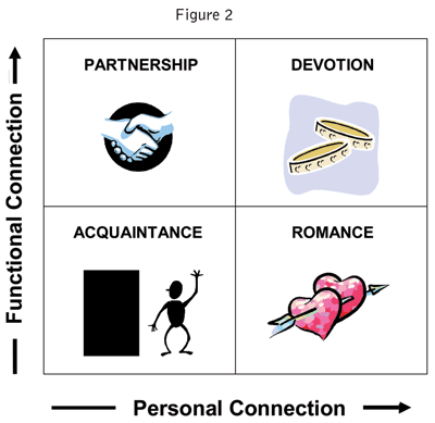 We can tap into the interpersonal relationship metaphor to illuminate the nature of customer-brand relationships. Figure 2 suggests at least four relationship types based on the relative strength of functional and personal connections. And, as in human relationships, differences between personal and functional connections result in different relationships with different outcomes.