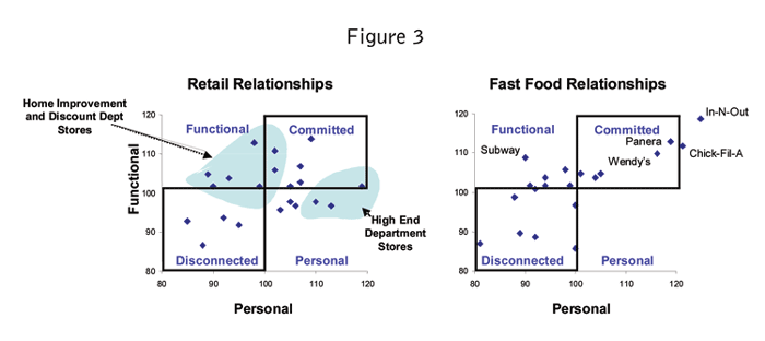 The first thing one might notice about the fast-food map is that there are no brands in the lower-right quadrant, which is high on personal connection and low on functional connection. This appears to reveal that, while a legitimate retail store position may focus primarily on personal relationship characteristics, fast-food relationships must be built on a solid functional foundation.