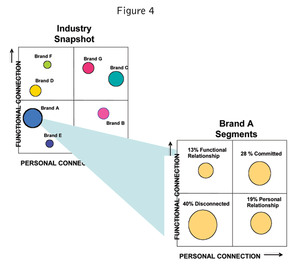 On the maps in Figure 3, the dimensions plotted on the vertical and horizontal axes are personal connection and functional connection. The quadrants are divided at the industry average. A brand in the upper-left quadrant for instance, is above average on functional connection, but below average on personal connection. We call these functional relationships. Conversely, personal relationships fall in the lower-right quadrant. Committed relationships, exhibited by high personal and functional connection, are in the upper-right quadrant, balanced against disconnected relationships in the lower-left quadrant.