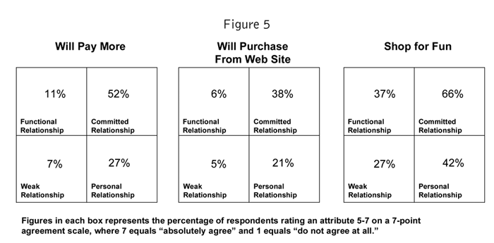 Relationship disposition has a direct impact on attitudes toward behavior. And whether customers have a personal or functional relationship indicates a bias toward certain positive, one might even say, profitable behavioral attitudes. For instance, retail customers in the personal relationship quadrant are more likely to be willing to pay more for a store’s products, use its Web site to purchase products and shop there as a leisure activity.