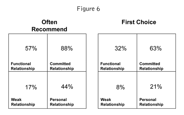 What is clear from Figures 5 and 6, however, is that relationships steeped in both functional and personal connections (or “committed” relationships) represent customers with the strongest attitudes toward a range of profitable behaviors. The committed customer objective becomes even more compelling when spending behavior is measured directly. In fact, committed retail customers reported spending over three times as much as other customers and claim a greater percentage of their retail spending at stores to which they are committed (see Figure 7).