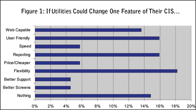 The results provide a number of interesting findings regarding the current CIS market. For example, respondents were asked which feature of their current customer information system they would change, if given the chance (Figure 1). Flexibility was the most common attribute cited (18.2 percent of respondents). Only 14.8 percent of the respondents indicated that they would not change a thing. This is the first time in the survey’s history that doing nothing was selected by fewer than 18 percent. This would suggest that utilities are growing less enamored of their current systems.