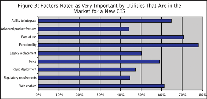 For the respondents who indicated that they were in the market for a new CIS, functionality was the factor most rated as very important. It was cited by over 77 percent of those utilities in the market for a new CIS as being very important (Figure 3).
