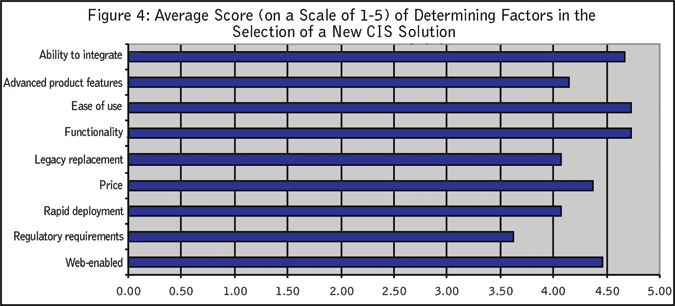 As shown in Figure 4, when considering replacing a CIS, on a scale of 1 to 5, where 5 is very important and 1 is not important at all, the determining factors with the highest average scores from the respondents that are in the market for a new CIS were for functionality (4.72) and ease of use (4.71). The lowest average score was for regulatory requirements (3.61).