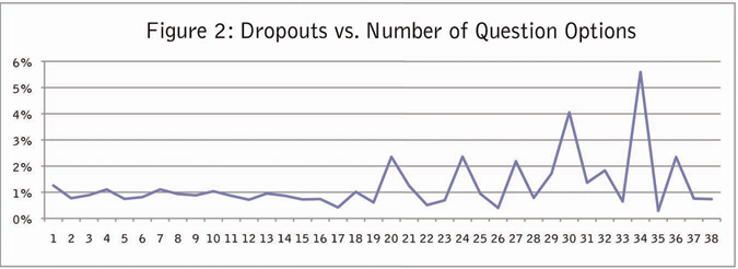 The key factor triggering dropout appears to be the number of options presented in a question. Figure 2 shows that dropout significantly increases when questions show more than 20 options on a page.