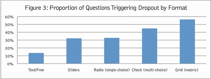 Nearly 60 percent of grid questions triggered some level of dropout, compared to 30 percent for standard single-choice questions;
