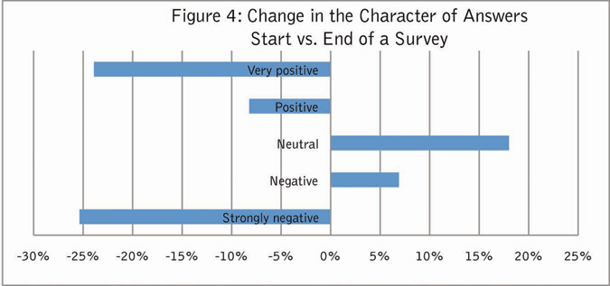 The test revealed an average 10 percent drop in the number of check-box selections in multi-response questions (Figure 4). When answering typical five-point-range questions, neutral/don’t know responses rose by 18 percent and we observed a 7 percent shift from slightly positive to slightly negative. Very positive and very negative responses both fell significantly by an average of 25 percent, but the differences tend to cancel each other out.