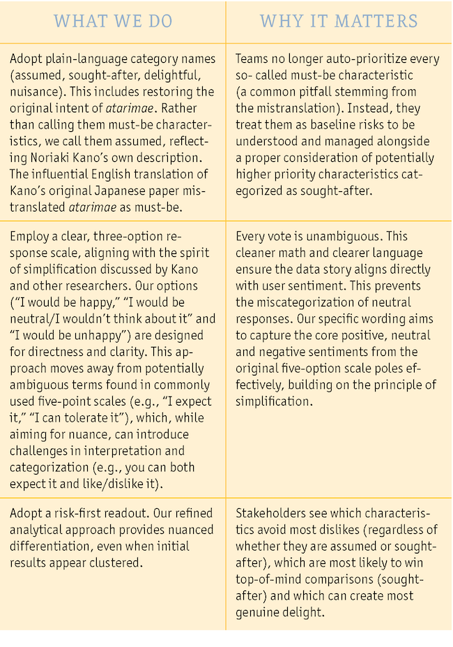 As shown in the accompanying box, product teams often find themselves forcing Kano results into familiar-but-incorrect schemas, such as automatically prioritizing all so-called must-be items first or misinterpreting so-called performance characteristics as dimensions where more is always better.