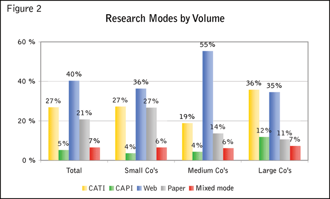Several large research companies have made it clear in various public announcements they wish to dump the “old” methods in favor of lower-cost and faster online surveys. How interesting it is to find that it is the medium-sized companies that seem to have achieved this balance. A whopping 55 percent of their volume is online, with everything else in the teens or single digits. Among large firms it is a fairly equal three-way split between CATI, Web and “the rest,” with CATI very slightly in the lead still.
