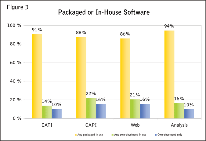 Figure 3 should have developers of market research software scratching their heads in bemusement. Although most market research firms use only packaged software bought from a supplier, one in five of the developers’ potential customers are using software they have written themselves for online or CAPI work. For CATI, one in every 10 system out there has been knitted at home.