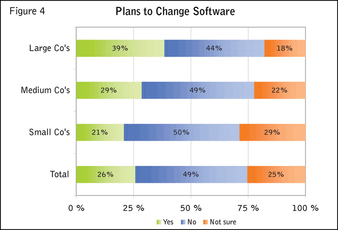 In 2006 we asked respondents for the first time whether they had plans to dump their existing software anytime soon. The strength of the “yes” we got took us aback. In Figure 4 you can see that only half (49 percent) of all companies are planning to keep their current software over the next one to two years. A quarter are planning to change their software and another quarter are undecided. Within large companies, these figures are even more striking, with under half (44 percent) planning to keep their software, but nearly two in every five are planning to buy new software within the next one to two years.