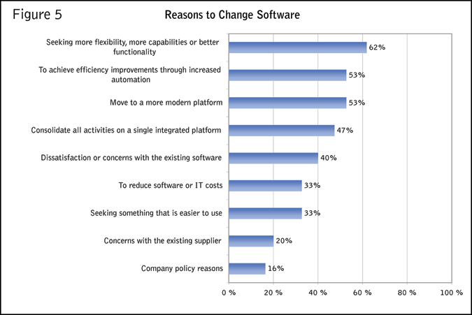 There are a diverse range of reasons for changing software, all of which are important. The most often cited reason for changing software is to seek “more flexibility, more capabilities or better functionality.” Nearly two thirds of respondents chose this.