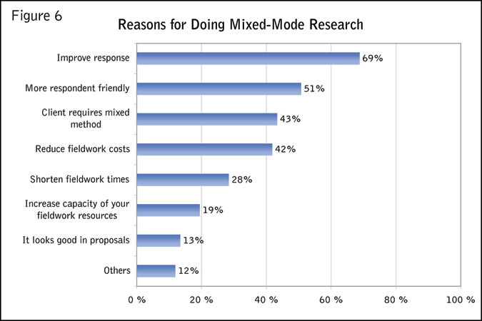 Tellingly, 42 percent of the time it is the client who is driving the decision by insisting that the survey uses a mixed methodology approach. This perhaps reveals a somewhat reactive approach in the industry to mixed-mode methodology still.