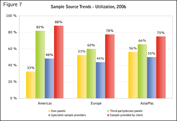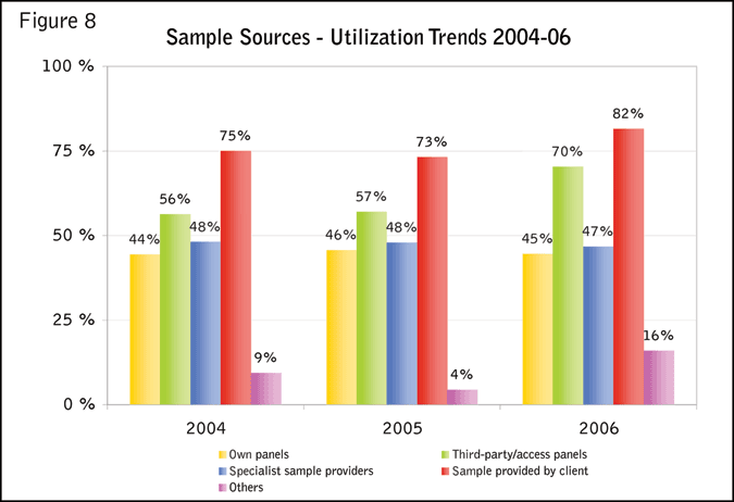 In our previous two studies, respondents consistently anticipated making less use of client-supplied sample in the future. But this remains an unfulfilled aspiration. The utilization of client sample actually increased in 2006 (it was 75 percent and 73 percent in 2004 and 2005 respectively, and 82 percent in 2006), showing a widening gulf between hopes and actions. Previously, it also seemed that access panels were gaining in popularity and the 2006 results confirm the ascendancy of the rented panel. In 2005, 57 percent used access panels, whereas 70 percent used them in 2006 (Figure 8).