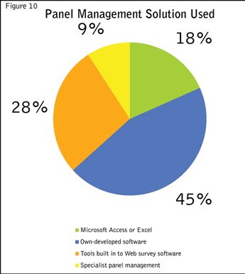 Figure 10 appears to show a golden opportunity for software developers, with very few people using off-the-shelf panel management tools. Nearly half of respondents report using their own in-house software for panel management. And a sizeable minority are still using office automation tools such as Microsoft Excel or Access, which offer poor quality control, no audit trail and considerable scope for human error.