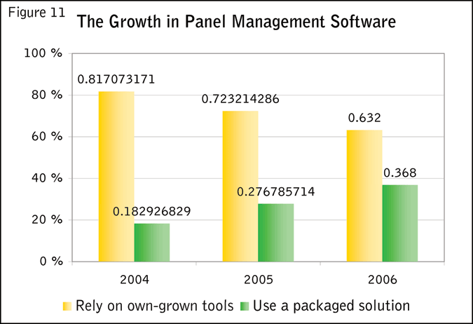 The panel management opportunities for software manufacturers were probably better last year, but remain good for a few years to come. For anyone developing a standalone product for panel management, they may not be as golden an opportunity as first appears. Closer examination of Figure 10 shows that there is already a clear move away from using in-house solutions and towards using the panel management capabilities in software provided by software developers. Nevertheless, the use of supplied panel tools has doubled in two years.