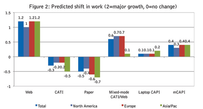 Given the findings shown in Figure 1, it is not surprising that the Web is predicted to be the main growth area, though we suspect this trajectory will begin to level out, given the high proportion it has already reached. Also a growth in mixed-mode CATI/Web and mCAPI seems inevitable as these technologies are maturing, making the task easier, and respondents are proving harder to reach by one channel and less so if more than one channel is combined. However, our respondents’ expectations are modest for other modes, especially for mCAPI. It is noticeable that the North Americans and Europeans expect mixed-mode CATI/Web to grow, whereas those in Asia-Pacific anticipate virtually no change.