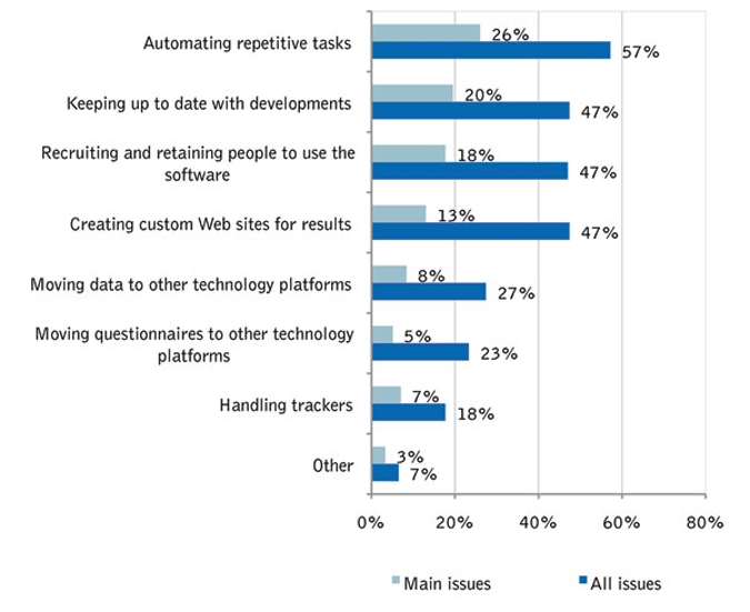 Figure 4 summarizes responses to a new question for 2008, in which we asked the respondents about the technology challenges they were facing. “Automating repetitive tasks” came out on top. If we had received this answer in 1984, we would have found the insight impressive. A quarter of a century later, we are wondering what went wrong, as this is what computing at its most basic is supposed to achieve. It’s a finding that does not speak well of the quality of the software that the industry is using and it may go some way to explaining some of the other findings we report later: many companies wish to change their software (Figure 6) and many market research companies are using bespoke tools (Figure 8).