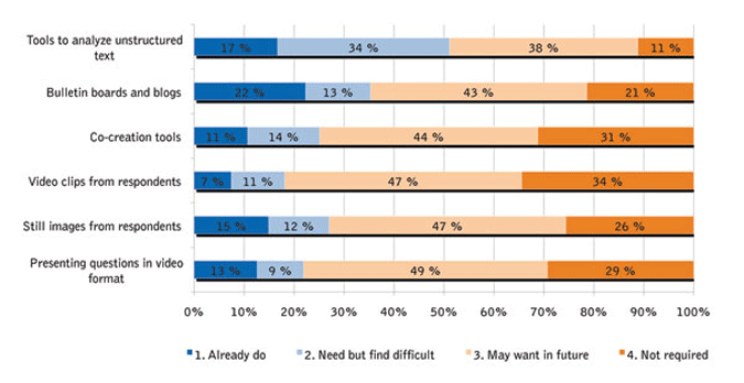 For the first time, we asked respondents about their use of six emerging Web 2.0-style technologies in their research (Figure 5). The profession seems to divide between innovators and traditionalists. Although a significant minority of traditionalists felt these technologies were not required, there were also an impressive number of innovators who are already using blogging and co-creating in their studies or who are making their questionnaires more high-tech by presenting questions in video format, for example. There are not many market research-specific tools that incorporate Web 2.0, so those already employing these approaches have clearly used some effort and a great deal of imagination. Some items seem harder to do than others - analyzing unstructured text stands out in particular - but co-creation also has more users struggling to do it than actually doing it.