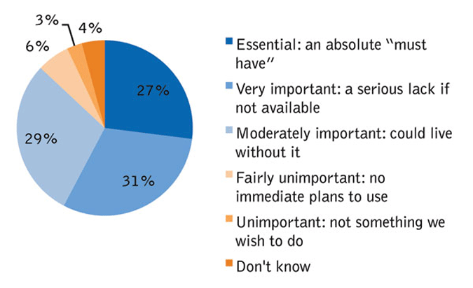 As Figure 7 illustrates, we asked: “If you were choosing new software, or reviewing your current solution, how much importance would you place on the tool’s ability to mix and combine different data collection modes?” Nearly all respondents think mixed-mode is important in new software. Given the ability of mixed-mode research to improve response rates - which respondents stated (in another question) was the main challenge the industry faces - it seems logical that the industry should wish to follow the path of mixed-mode. Thus it’s a little surprising or even contradictory that in Figure 2 the expected growth of mixed-mode is so modest. However, many research companies appear to be unconvinced on the merits of multichannel research projects, and wish to adopt mixed-mode research platforms for the internal efficiencies they bring. In a separate question, we asked what level of functionality was required and only 21 percent said they needed the functionality to support mixed-mode projects where interviews can switch from one channel to another, 51 percent sought the ability to run mixed-mode samples in parallel and 22 percent were only seeking the benefits of one common platform for authoring and deployment.
