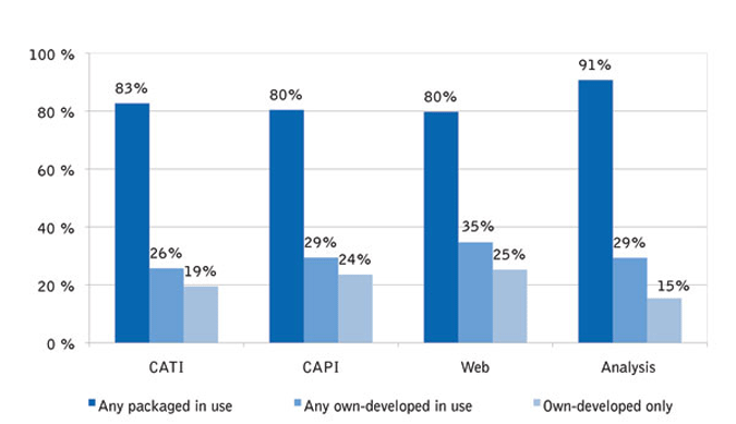 In fact with Web (and indeed CAPI, though on a very small base) the use of packaged software has also increased, with 72 percent using packaged Web software in 2007 against 80 percent in 2008. As we saw in Figure 1, the number of companies offering Web research as a service is clearly growing but a proportion of the resulting spending on new technology is staying in-house and being put toward developing own-grown solutions.