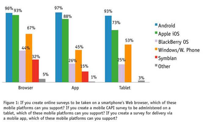 We were interested in the specific platforms they could support; the results can be seen in Figure 1. Android and Apple iOS dominate, though Android appears to have the edge. This is more apparent when firms get to choose the hardware themselves for CAPI, where Android shows a 20 percent lead.