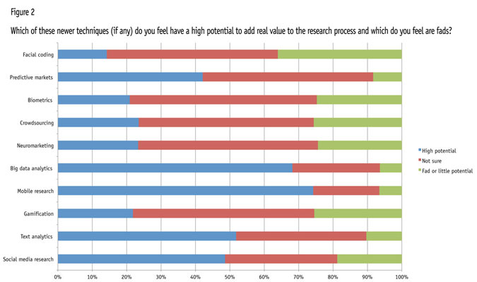 Indeed, data from our study shows that they are very much open to considering newer approaches and aren’t rejecting them out of hand simply because of their novelty. We asked respondents to rate the potential of a number of newer methods (Figure 2), from social media research and gamification to crowdsourcing and biometrics. Mobile research and big data analytics garnered the largest number of “high potential” votes, followed by text analytics and social media research. Facial coding, crowdsourcing and gamification drew the highest number of “fad or little potential” votes. In the main, though, the “not sure” votes won out in most cases, showing that more evidence is needed to convince those on the fence that these trendy techniques have staying power.