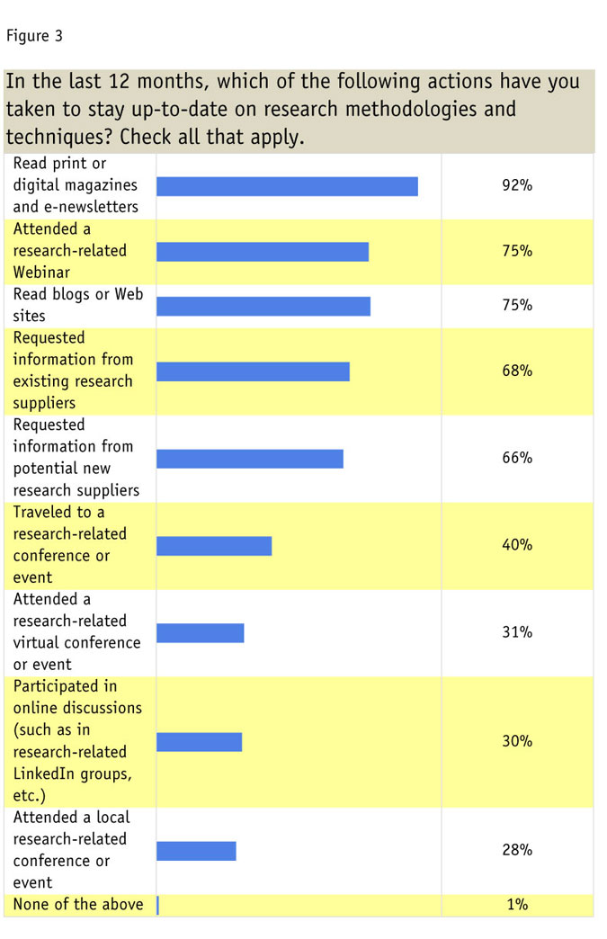When it comes to staying on top of what’s new in the industry, as shown in Figure 3, researchers cited reading print or digital magazines and e-newsletters, attending research-related Webinars and reading blogs or Web sites as their top choices (multiple responses were accepted). Requesting information from existing or new suppliers was also popular. Less popular but not insignificant were attending research-related conferences or events, both in-person and virtual.