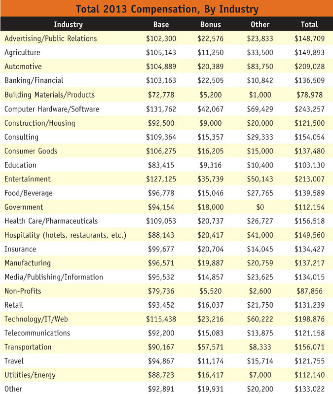 The salary progression in the other two categories is probably less surprising, given the advances in – and rapid adoption of – technology over the past five years. The 2013 average in the computer hardware/software industry is $243,257 (the highest in any industry), up from $134,765 in 2012; $101,517 in 2011; $101,077 in 2010; and $113,373 in 2009. A similarly dramatic trend is evident in the technology/IT/Web sector, as the average salary has steadily increased from $82,809 in 2009 to $198,876 in 2013. Not a bad trajectory!