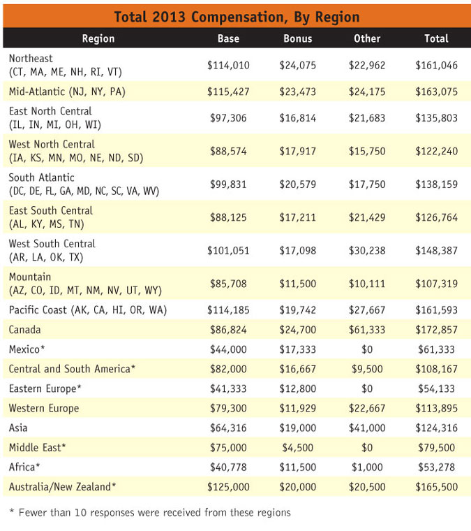 Internationally, of the countries/regions that generated more than 10 responses, Canada and Asia experienced the greatest deviation from previous years – favorable for Canada, dismal for Asia. In Canada, the average salary increased from $98,926 in 2012 to a whopping $172,857. Asia, on the other hand, decreased from $141,316 in 2012 to $124,316 in 2013.