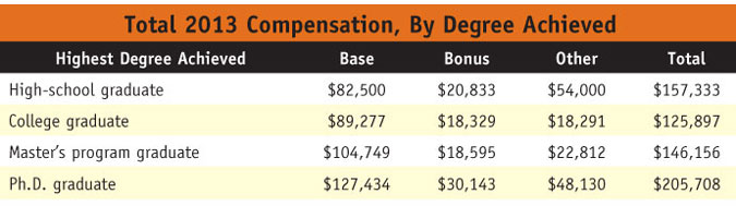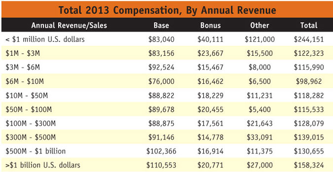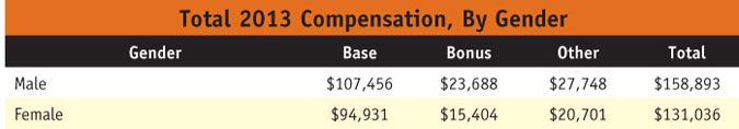 Again, senior vice presidents and vice presidents are earning significantly more than presidents/CEOs/COOs. We called out this discrepancy in our 2012 report and upon further investigation, we found that the sample of respondents with the title president/CEO/COO in 2013 was significantly smaller than that of senior vice presidents and vice presidents (three respondents compared to 71, to be exact). This has perplexed us in previous years and now on our fifth iteration, we are confident in attributing this outlying data point to an inadequate/unequal sample.