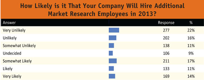 Oddly enough, as client-side researchers are more and more content to stay put, more companies are expected to hire additional market research employees in 2013 than ever before. So this could be good news for those looking for a new position as the candidate pool dwindles and job openings increase. For reference, in 2010, 33 percent of respondents said their company was somewhat likely, likely or very likely to hire additional MR employees; 37 percent in 2011; and 38 percent in 2012. This year, the figure jumped another four points to 42 percent, which is well outside the study’s margin of error. Specifically, 14 percent said it is very likely that their company would hire additional MR employees, 11 percent likely and 17 percent somewhat likely.
