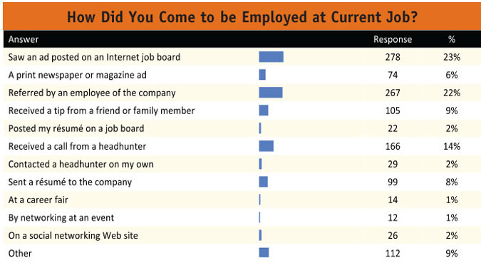 While recent data have indicated that social media is being used more and more to post jobs and find talent, a mere 2 percent of respondents found their current position via social media. Only 2 percent had success at a career fair or networking event but personal networking in general is one of the most powerful influencers. Personal referrals by an employee within the company or a tip from a friend or family member were two popular methods of finding employment at 22 and 9 percent, respectively. Turns out it really is all about who you know!