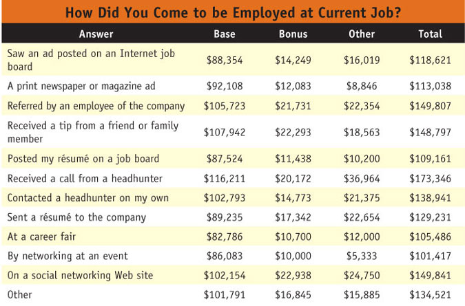 Another 14 percent were fortunate enough to be contacted by a headhunter and 2 percent reached out to a headhunter on their own. Fortunate because those who received a call from the headhunter about a position earn on average over $173,000, which is almost $14,000 more than the next-highest-paying methods (referral from friend or family member and social networking) and almost $30,000 more than the average salary among corporate researchers. Conversely, the unfruitful career fairs and networking events seem to be doubly so, as these methods yielded the lowest salaries by a wide margin, at $105,486 and $101,417, respectively.