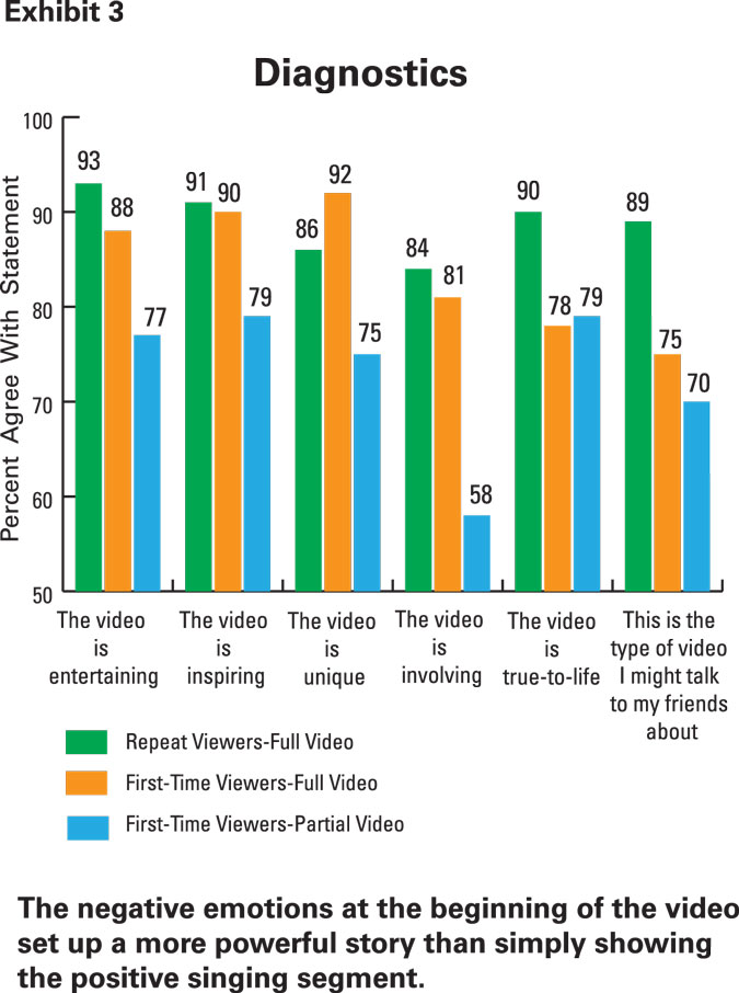 To find out, we decided to test another version of the video among a matched sample of respondents who had never before seen the video. This version was shorter by a minute because we chopped off the opening interview that had generated all the negative, skeptical emotions and simply started at the point where Boyle began to sing.