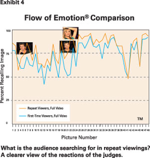 The repeat-viewing audience is actually paying relatively more attention to the faces of the judges, particularly Cowell's face. The audience is also increasingly sensitive to the nonverbal cues given off by their facial expressions. With repeat viewings, Cowell's skepticism rating goes up from 41 percent to 52 percent, and his surprise rating goes up from 25 percent to 41 percent.