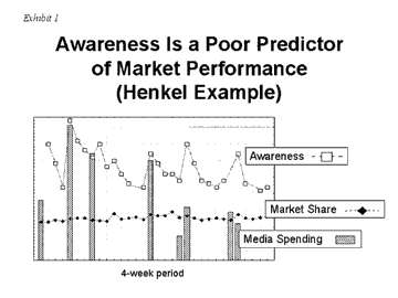 Henkel has also observed the poor predictability of awareness measures. Exhibit 1 (which comes from IDIS - Henkel’s transnational and integrated data warehouse) clearly demonstrates that while awareness generally increases and decreases with media spending, there is virtually no relationship between awareness and market share.
