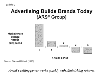 The empirical evidence from a number of studies led the ARS Group to conclude: “Effective delivery of advertising occurs much faster (with diminishing returns), or with fewer GRPs, than has been indicated through traditional tracking measurements” (Blair, 1987). About three years later, IRI’s Abraham and Lodish (1990) reported in the Harvard Business Review that: “When a particular advertising weight or copy is effective, it works relatively rapidly. Incremental sales begin to occur within six months.” Then, five years after that, John Philip Jones’ STAS (“Short-Term Advertising Strength”) research led him to state: “STAS measurements establish reliably that advertising can have an immediate and short-term (seven-day) influence on sales” (Jones, 1995a). Of course, the size of this influence depends on the ad’s persuasiveness or elasticity.